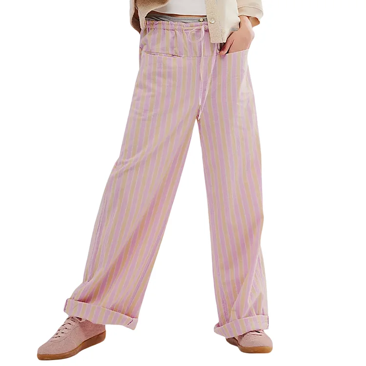 Women Baggy Pants Drawstring Waist Wide Leg Striped Pants Multiple Pockets Trousers